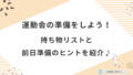 暮らし 運動会の準備をしよう! 持ち物リストと前日準備のヒントを紹介♪ 子どもの運動会を安心して楽しむために必要な持ち物を紹介! 子ども用・保護者用・あると便利なものまで、前日に準備できるよう持ち物リストをまとめました。この記事を見て、忘れ物ゼロで当日を迎えましょう。 2025.09.26 暮らし