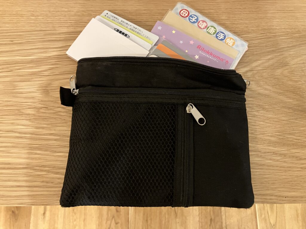 長財布の中を整理するための、カード入れ。ひとつのケースに一人分のマイナンバーカード、診察券を入れ、母子手帳、お薬手帳、子ども医療券はそれぞれそのままポーチに入れました。